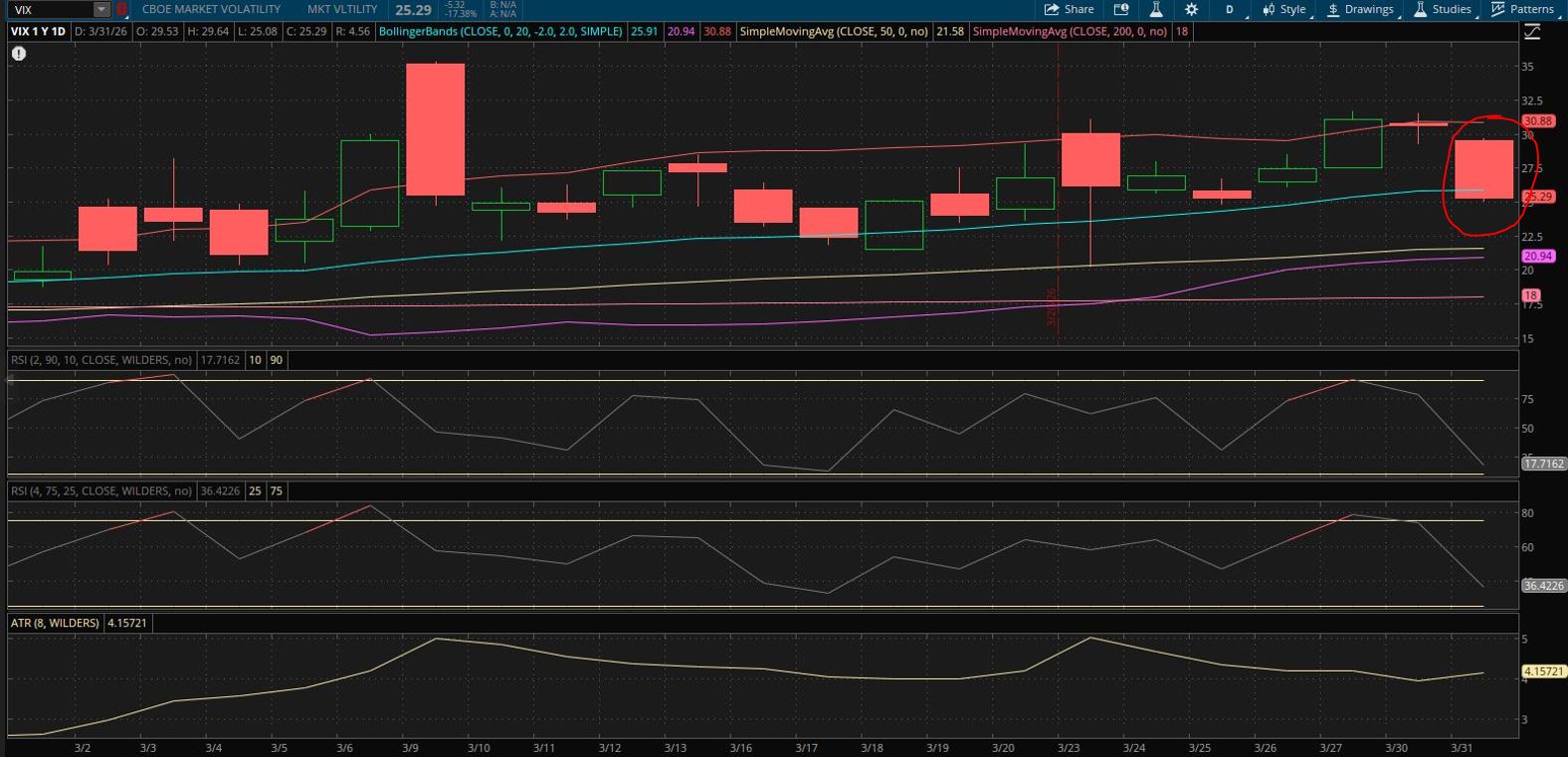 Trading on the final day of Q1 (one week ago) brings the following for SPX and VIX, respectively (circled candles):